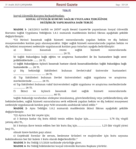 Bugünkü Resmi Gazetede yayınlanan Sağlık Uygulama Tebliğinde yapılan değişiklik ile muayenelerde katılım payı tutarları 01.01.2026 tarihinden itibaren yeniden belirlenmiştir.